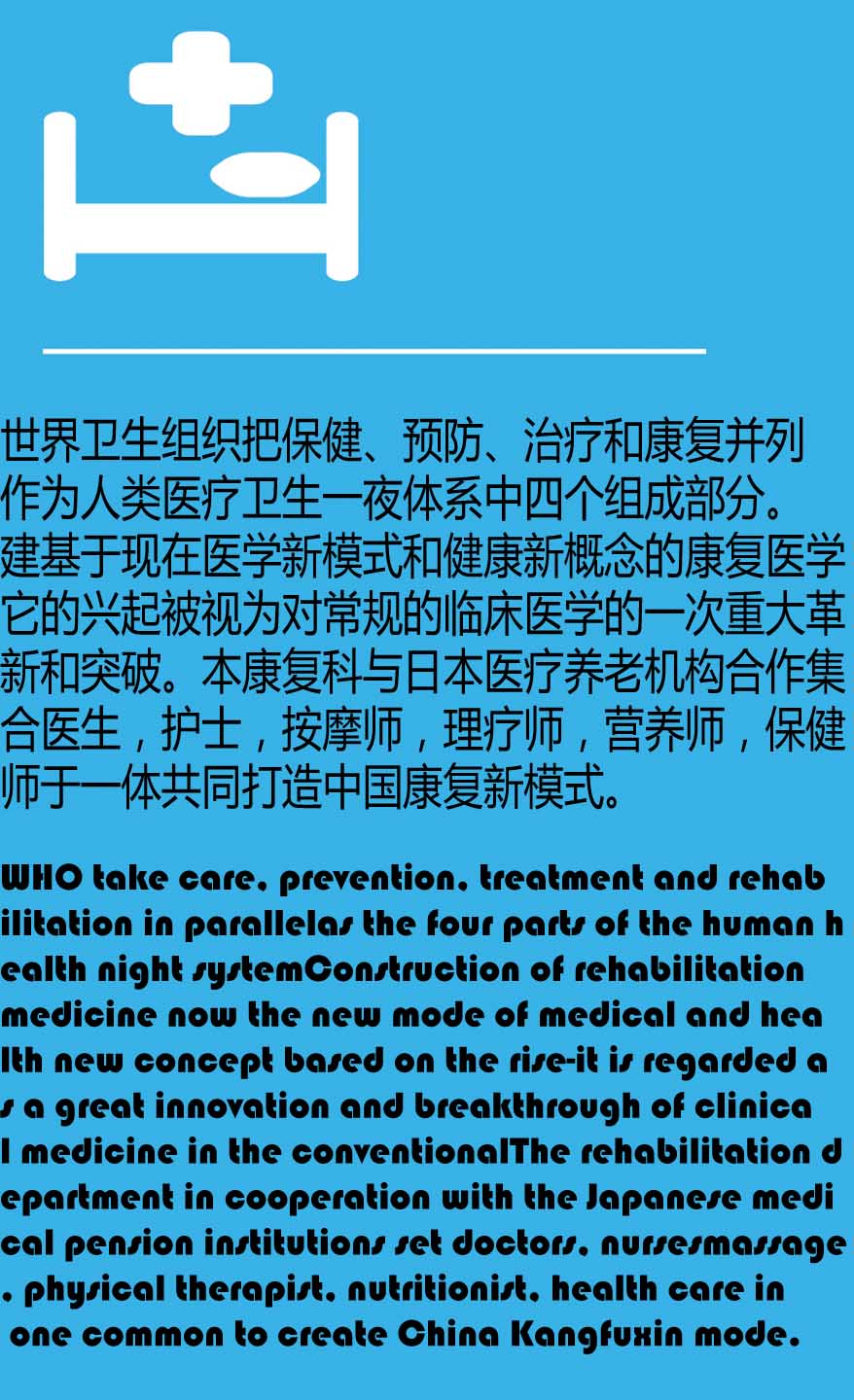 WHO take care, prevention, treatment and rehabilitation in parallel as the four parts of the human health night system Construction of rehabilitation medicine now the new mode of medical and health new concept based on the rise- it is regarded as a great innovation and breakthrough of clinical medicine in the conventional The rehabilitation department in cooperation with the Japanese medical pension institutions set doctors, nurses massage, physical therapist, nutritionist, health care in one common to create China Kangfuxin mode.